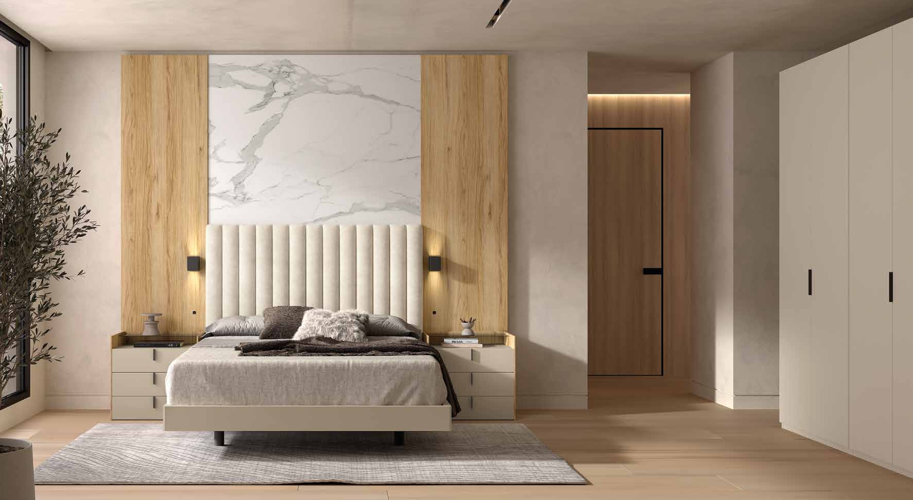 Descubre el nuevo programa Noa: un dormitorio contemporáneo protagonizado por un cálido cabecero tapizado y un espectacular panelado integrado que combina madera y efecto mármol.